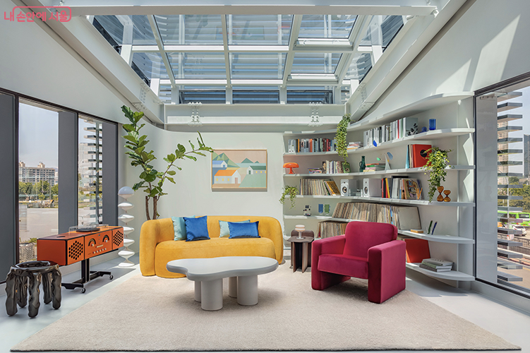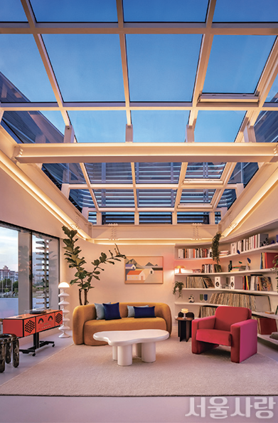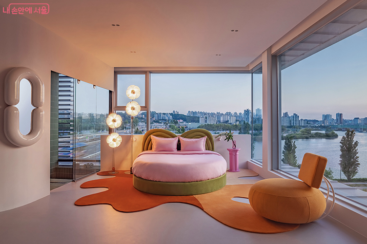 '스카이 스위트'는 44평 크기로, 최대 4명까지 입실 가능합니다. 침실 남서쪽에 큰 통창을 설치해 노들섬에서 여의도까지 이어지는 한강의 매력적인 전경을 한눈에 즐길 수 있는 것이 이 호텔의 최대 장점입니다. 특히나 천장은 유리로 마감해 도시 야경과 하늘을 올려다볼 수 있습니다.
