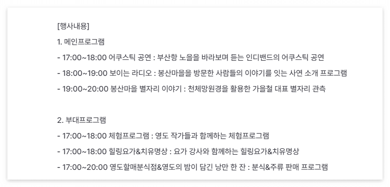 본 행사는 총 17시부터 20시까지 3시간 동안 영도구 봉산마을 마실길에서 열리는 페스티벌입니다.
