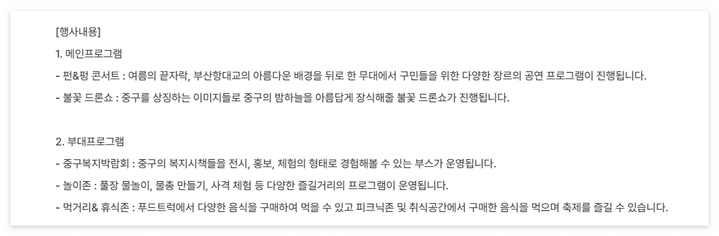 올해는 중구복지박람회도 함께 진행되는 만큼 가족, 친구, 연인 등과 함께 다양한 체험과 전시를 관람할 수 있는 프로그램들도 가득 채워질 예정이다. 무대 프로그램으로는 펀&펑 콘서트가 진행이 됩니다. 노라조, 싸이버거, 손민채 등 축하 공연과 하이라이트 쇼인 피날레 불꽃 드론쇼도 함께 만나볼 수 있습니다.